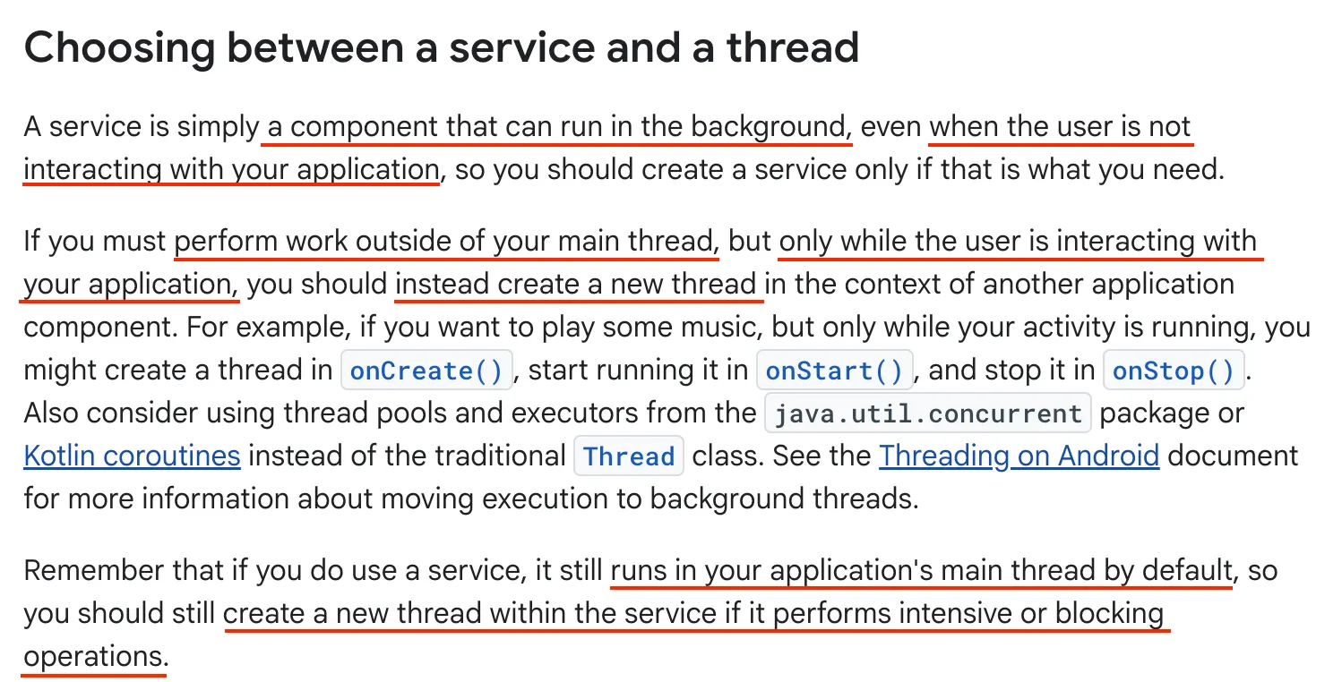 앱이 포그라운드에 있을 때만 메인 스레드 밖에서 작업을 수행해야 한다면 코틀린 코루틴이나 새로운 스레드를 사용하는 것이 적절하다. 서비스를 사용하더라도 기본적으로 메인 스레드에서 실행되므로 집약적인 작업 시 서비스 내부에 별도의 스레드를 직접 생성해야 한다.