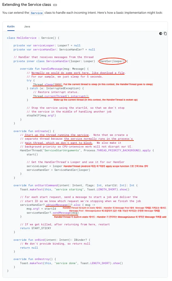 서비스를 확장하는 것은 각 수신 인텐트를 직접 처리할 수 있는 가장 기본적인 구현 방식이다. 서비스는 기본적으로 애플리케이션의 메인 스레드에서 실행되므로, UI 작업을 방해하지 않기 위해 백그라운드 스레드(예: HandlerThread)를 생성하여 작업을 수행해야 한다.