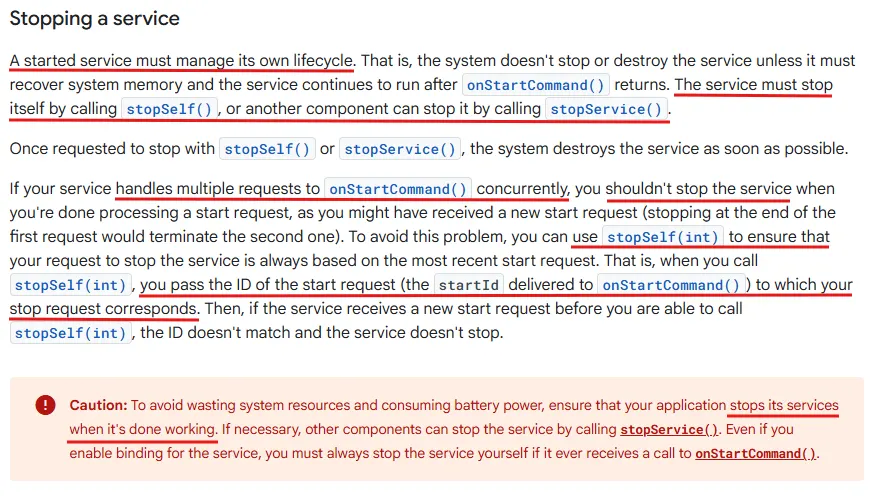Caution : 시스템 자원 낭비와 배터리 소모를 방지하기 위해 작업이 완료된 서비스는 반드시 중단해야 한다. 서비스에 바인딩을 허용했더라도 onStartCommand() 호출을 한 번이라도 받았다면 개발자가 직접 서비스를 중단해야 한다는 점에 유의해야 한다.