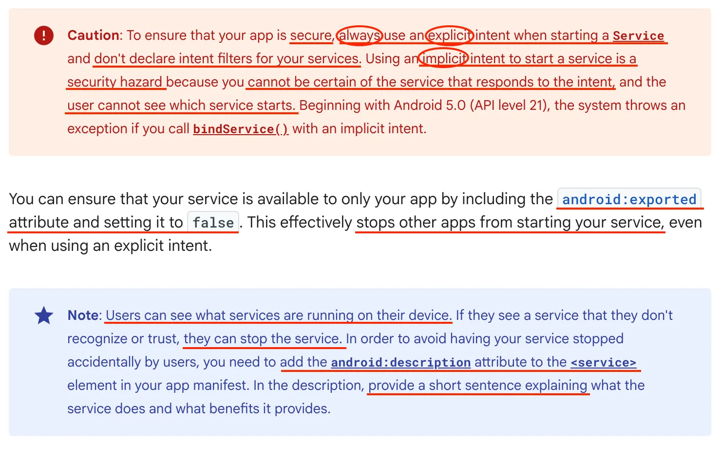 사용자는 기기에서 어떤 서비스가 실행 중인지 확인할 수 있으며, 인식하지 못하거나 신뢰할 수 없는 서비스는 직접 중지할 수 있다. 사용자가 실수로 서비스를 중단하는 것을 방지하려면 앱 매니페스트의 service 요소에 android:description 속성을 추가해야 한다. 설명문에는 서비스가 수행하는 작업과 이를 통해 제공되는 이점을 설명하는 짧은 문장을 제공해야 한다.
