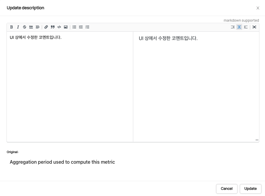 테이블 별 / 컬럼 별 풍부한 마크다운 문서 작성이 가능하고, 원본 소스의 Description을 보존합니다.