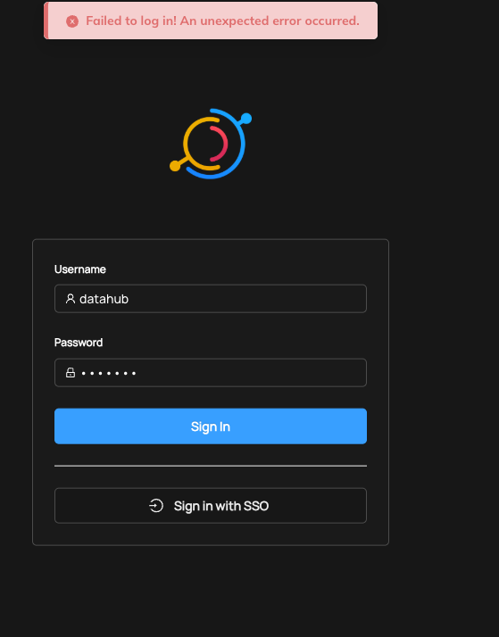 username과 password 모두 기본으로 지정된 datahub를 입력하였지만 'Failed to log in! an unexpected error occurred.' 오류가 나타났습니다.