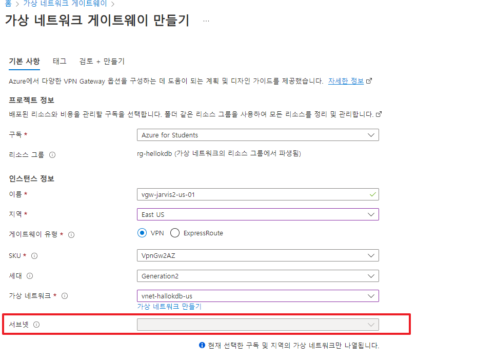->서브넷 설정이 불가하므로 먼저 게이트웨이 서브넷 부터 만든다