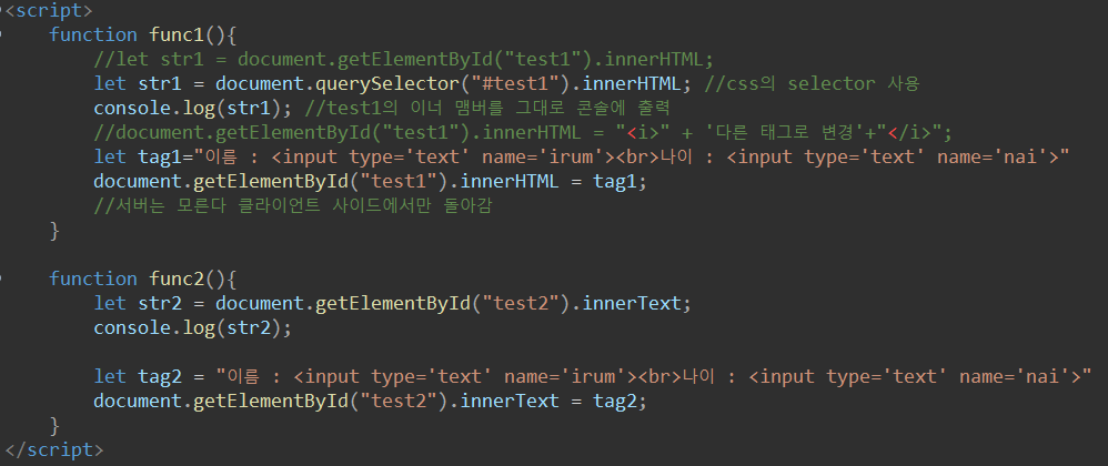 innerHTML은 태그값까지 불러오거나 태그값을 포함하여 삽입이 된다.