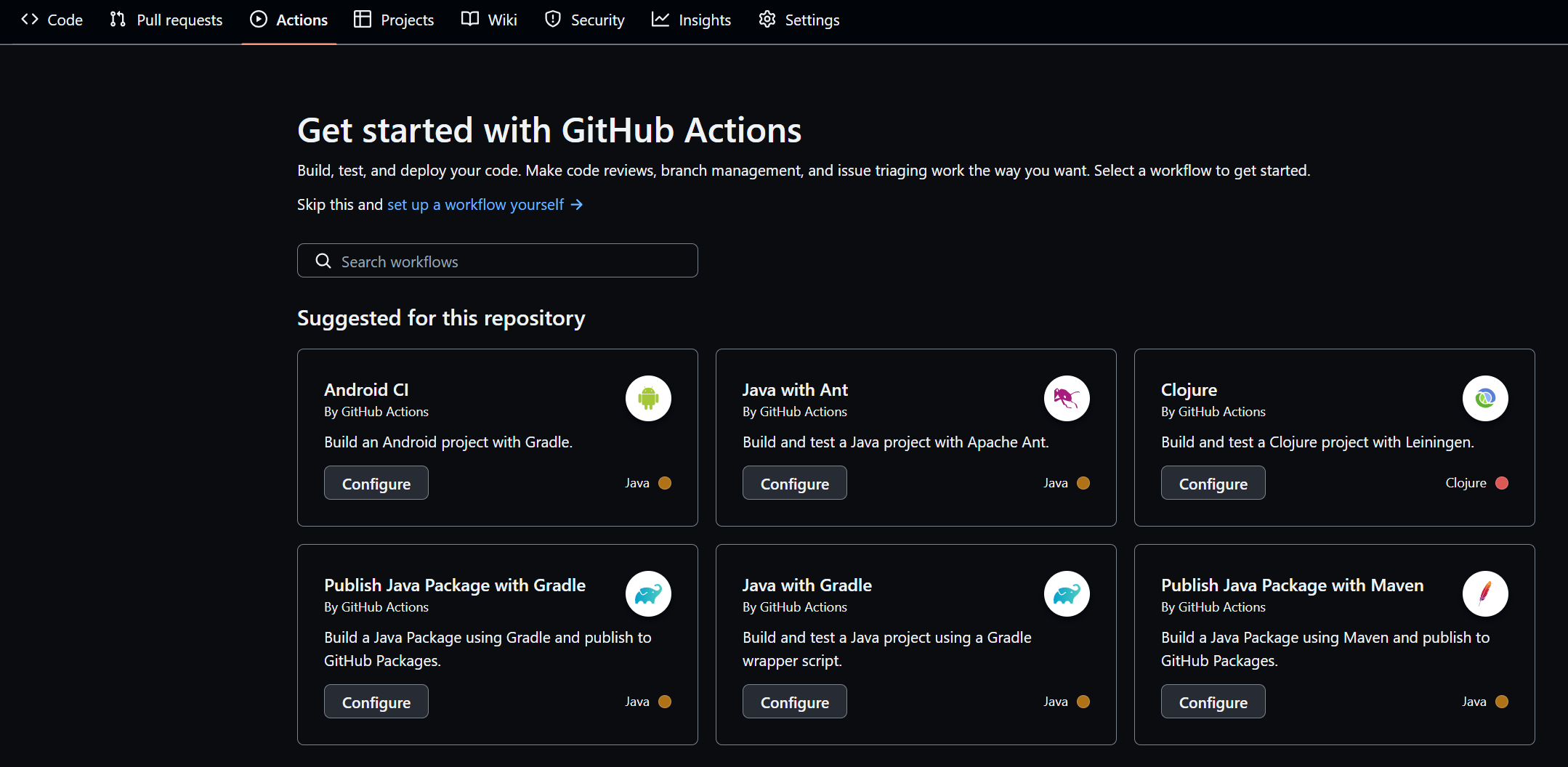 spring은 빌드툴로 gradle을 많이 사용하니 gradle을 configure하면 gradle.yml 파일 작성이 나온다. gradle.yml이 workflow를 위한 설정 파일이다.