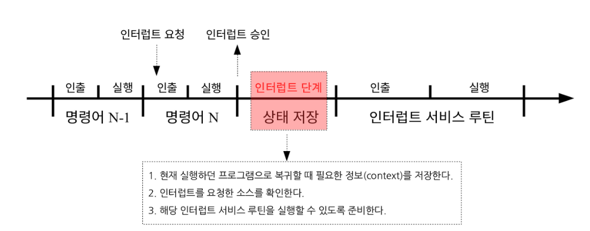 CPU는 인터럽트 요청이 들어오는 즉시 프로그램을 중단하는것이 아닌 실행되고있는 명령어 단위가 끝날때 마다 요청을 확인하여 인터럽트를 승인시킨다.