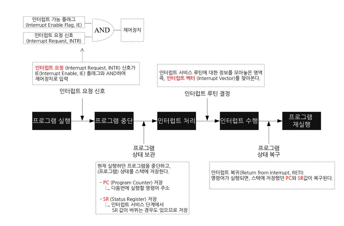 CPU가 프로그램을 실행하고 있을 때, 입출력 하드웨어 등의 장치나 예외상황이 발생하여 처리가 필요할 경우에 CPU에게 알려 실행중인 작업을 중단하고 처리