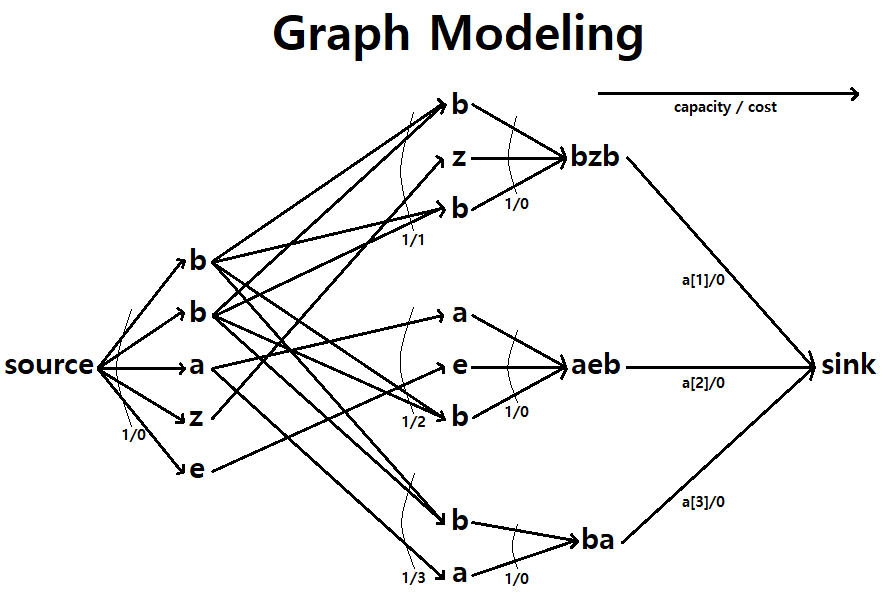 t의 각 문자는 si의 문자열의 문자를 하나 꺼내써야 하는데, 이때 비용은 i(1-based index)이므로 t의 각 문자 -> si의 각 문자로 일치하는 문자끼리 간선을 잇고 용량은 1, 비용은 i