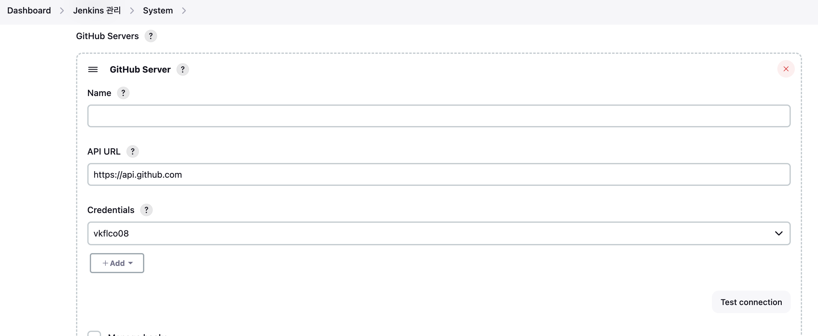 Git 연결 확인: Jenkins에서 Git 저장소에 접근할 수 있도록 설정한다.
