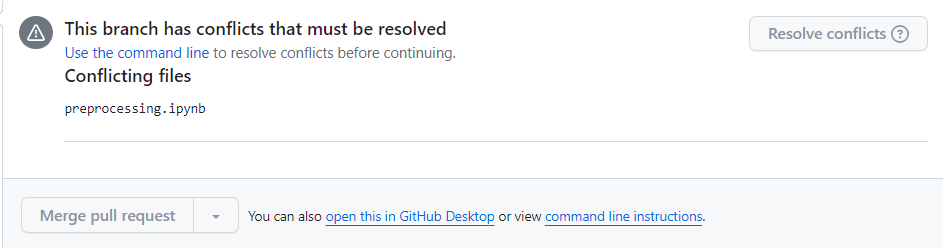 병합할때마다 메타데이터와 실행결과로 인해 conflict가 지속적으로 발생했다. 물론 conflict가 적을땐 깃허브에서 해결가능하지만, 그림처럼 너무 많은부분에서 문제가 있으면 아예 해결이 안된다. 로컬로 가져와서 CLI로 좀 만져봤지만 실패했다.😓