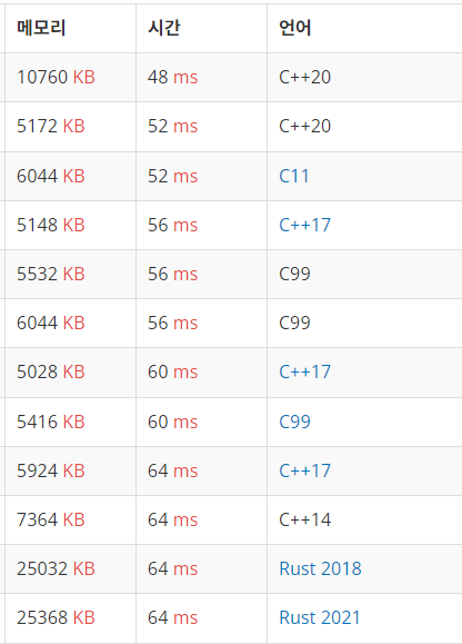특정문제의 걸린시간 랭킹. C, C++, Rust같은 언어만 보입니다.