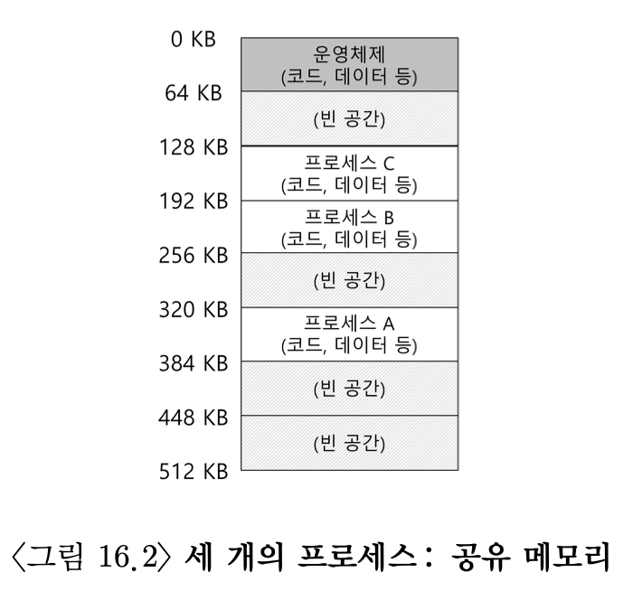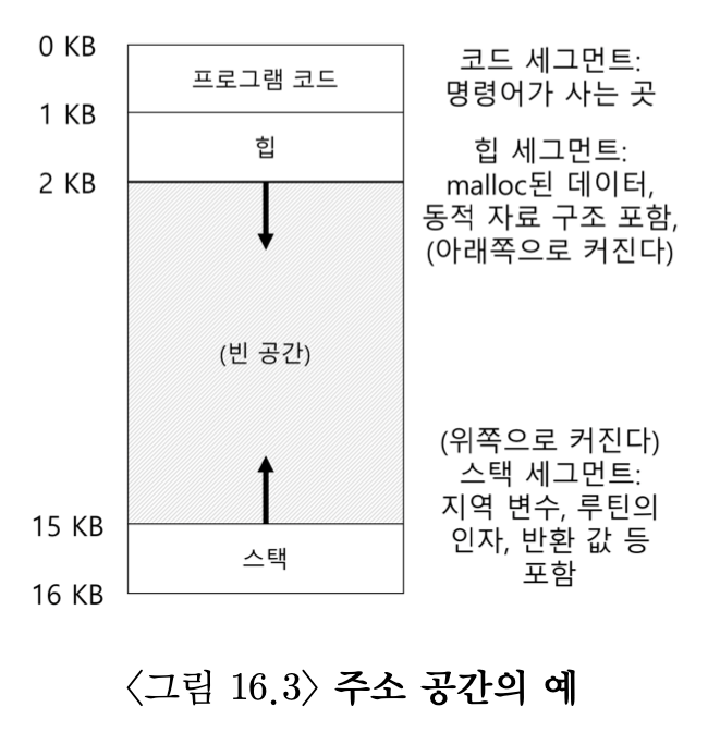 주소 공간은 실행 중인 프로그램(=프로세스)이 가정하는 메모리의 모습입니다. 운영체제에서 메모리 개념을 이해하는 것이 메모리를 어떻게 가상화할지를 이해하는 핵심과도 같습니다. 하나의 주소 공간에는 실행 프로그램의 모든 메모리 상태를 갖고 있습니다. 메모리 내 각 세그먼트(메모리에서 특정 길이를 갖는 연속적인 주소 공간)가 나타나 있으며 각각 코드, 힙, 빈 공간, 스택 세그먼트로 구성되어 있습니다