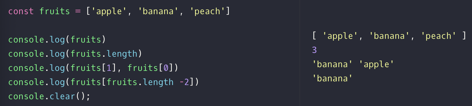 console.log(fruits[0]) 이런식으로 배열의 원하는 값을 불러 올수 있습니다.