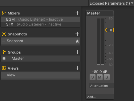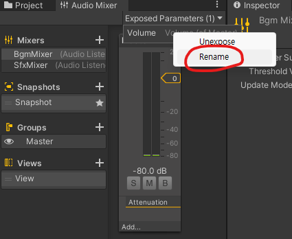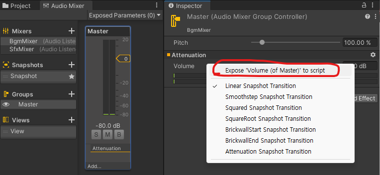 그리고 Audio Mixer를 스크립트에서 관리하려면 Inspector창에서 한가지 설정이 필요하다. 아래 사진과 같이 Attenuation의 Volume부분을 우클릭해서 Expose 'Volume (of Master) to script