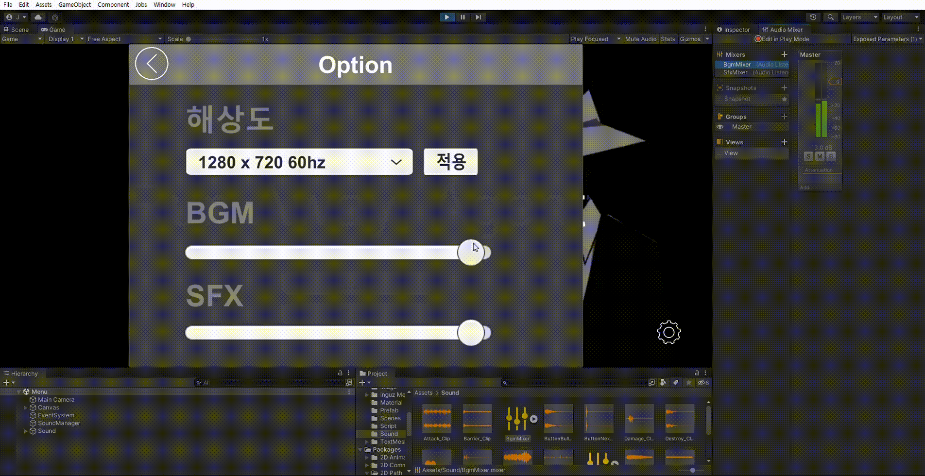 저번에 해상도를 변경할 수 있는 설정을 만들었다. 설정창에 해상도변경 기능밖에 없어 되게 허전한 느낌이다. 그래서 이번엔 인게임 내에서 사운드를 조절하는 설정을 만들어 볼 예정이다.