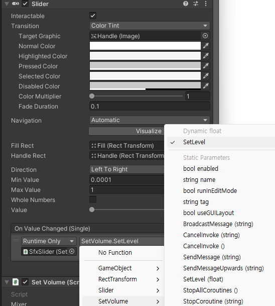 그리고 OnValueChanged 함수에 아래 사진과 같이 SetVolume.cs의 SetLevel을 넣어주면 된다.
