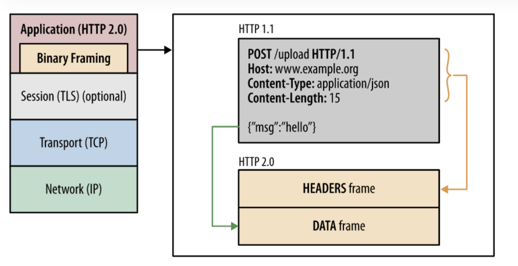 HTTP 1.1과 HTTP 2.0의 주요한 차이점은 HTTP 메세지가 1.1에서는 text로 전송되었던 것과 달리, 2.0에서는 binary frame로 인코딩되어 전송된다는 점이다.