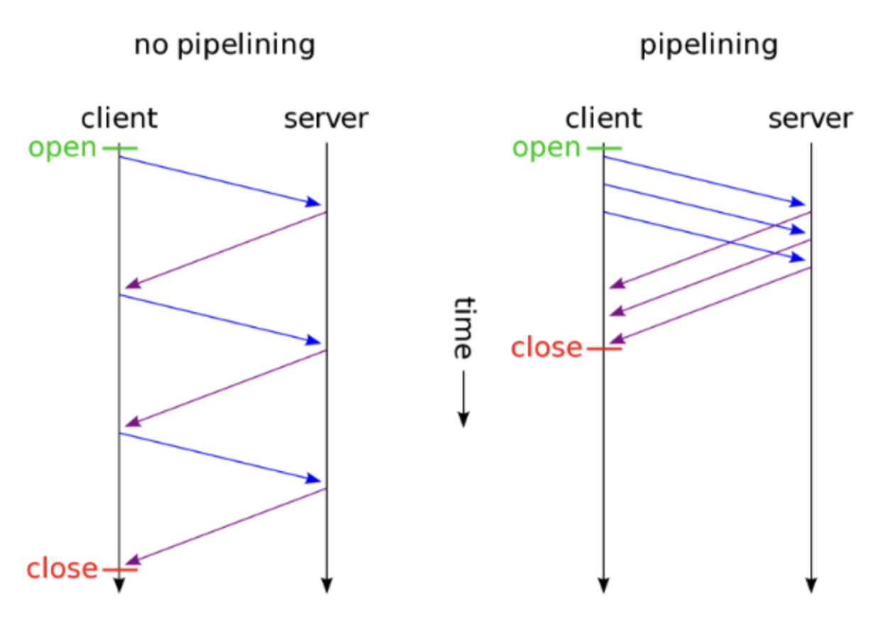 파이프 라이닝은 여러개의 요청을 보낼때 처음 요청이 응답될 때까지 기다리지 않고 바로 요청을 한꺼번에 보내는 것을 의미한다. 즉, 여러개의 요청을 한꺼번에 보내서 응답을 받음으로서 대기시간을 줄이는 기술이다.