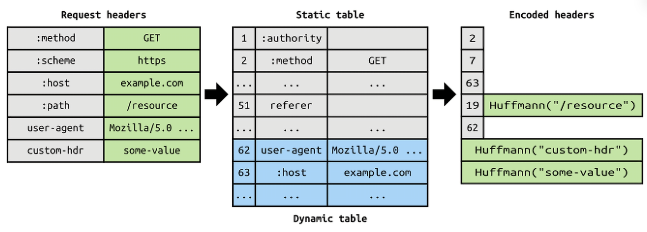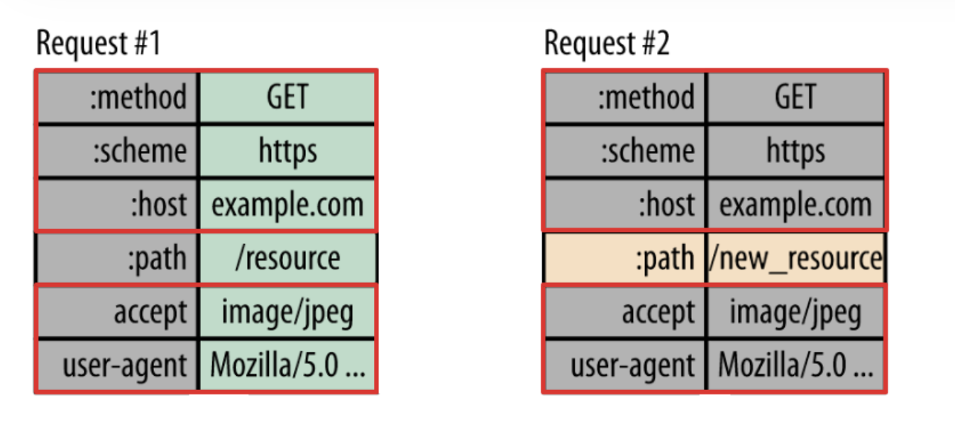 HTTP 2.0에서는 헤더 압축(HPACK)과 헤더의 중복 제거(Multiplexing과 함께)가 도입되었습니다. 이를 통해 같은 커넥션 상에서 중복되는 헤더를 줄이고 성능을 개선할 수 있었다.