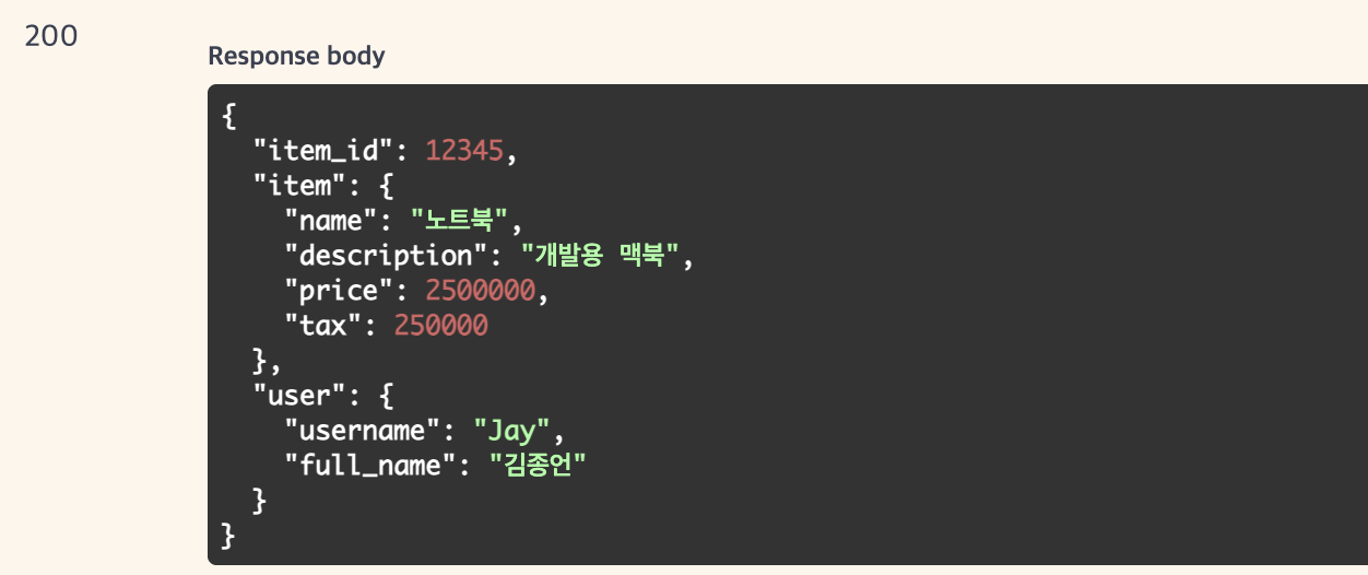 ํ๋ผ๋ฏธํฐ๊ฐ 2๊ฐ๊ฐ ๋๋๊น ๊ฐ ํ๋ผ๋ฏธํฐ ์ด๋ฆ์ด key๊ฐ ๋๊ณ , ๊ทธ ์์ ๋ชจ๋ธ์ ํ๋๊ฐ ๋ค์ด๊ฐ๋ค. ๐ FastAPI๊ฐ ์๋์ผ๋ก ์ด๋ ๊ฒ ์ฒ๋ฆฌํด์ค!
