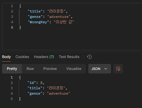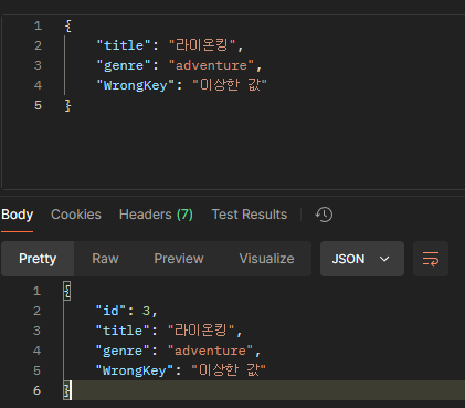 Dto에 정의되지 않은"WrongKey": "이상한 값"이 무시되는 것을 알 수 있다.