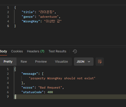 Dto에 지정되지 않은 값이 들어오자 에러를 반환하는것을 볼 수 있다.