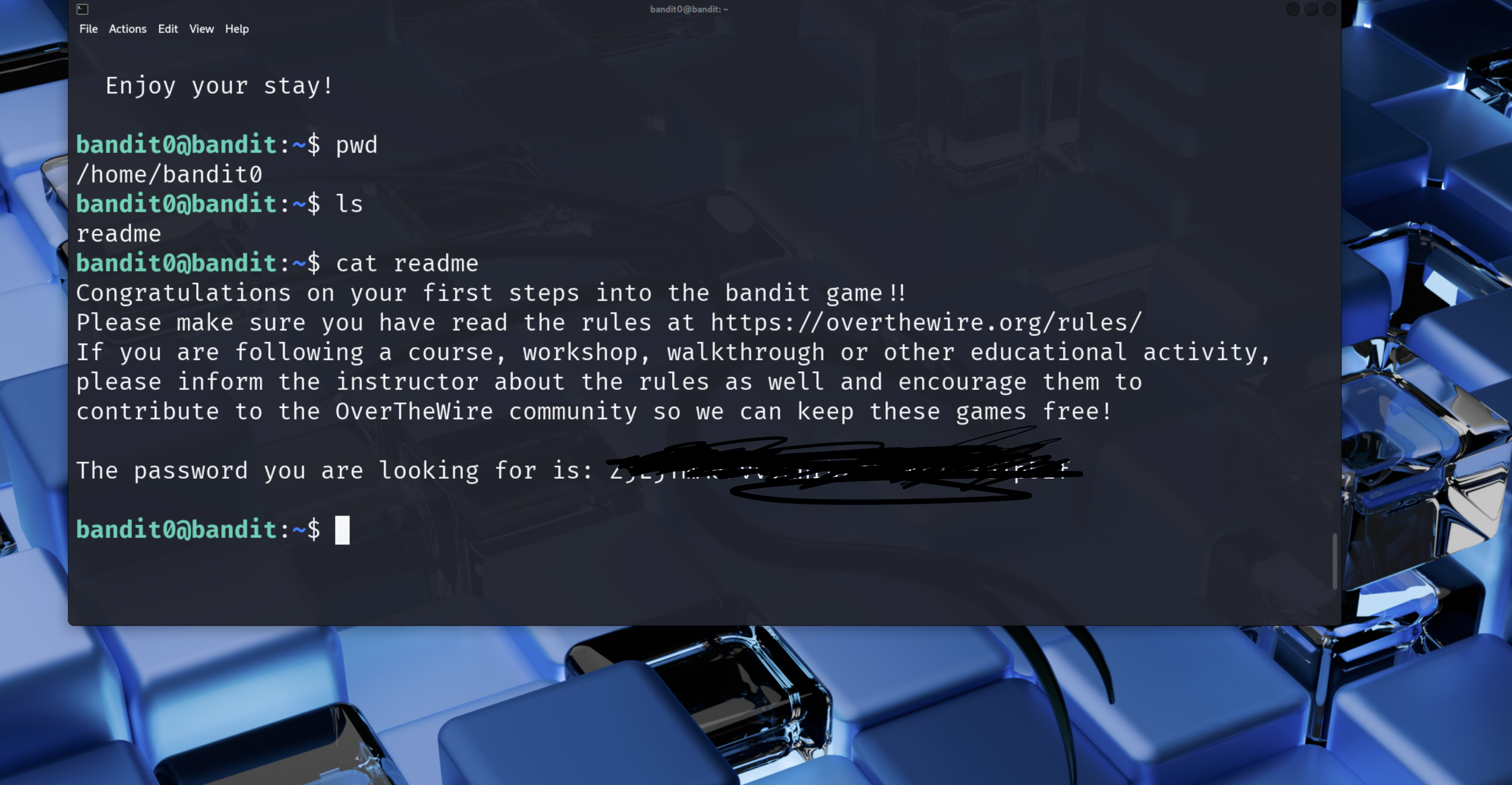 The password for the next level is stored in a file called readme located in the home directory. Use this password to log into bandit1 using SSH. Whenever you find a password for a level, use SSH (on port 2220) to log into that level and continue the game.