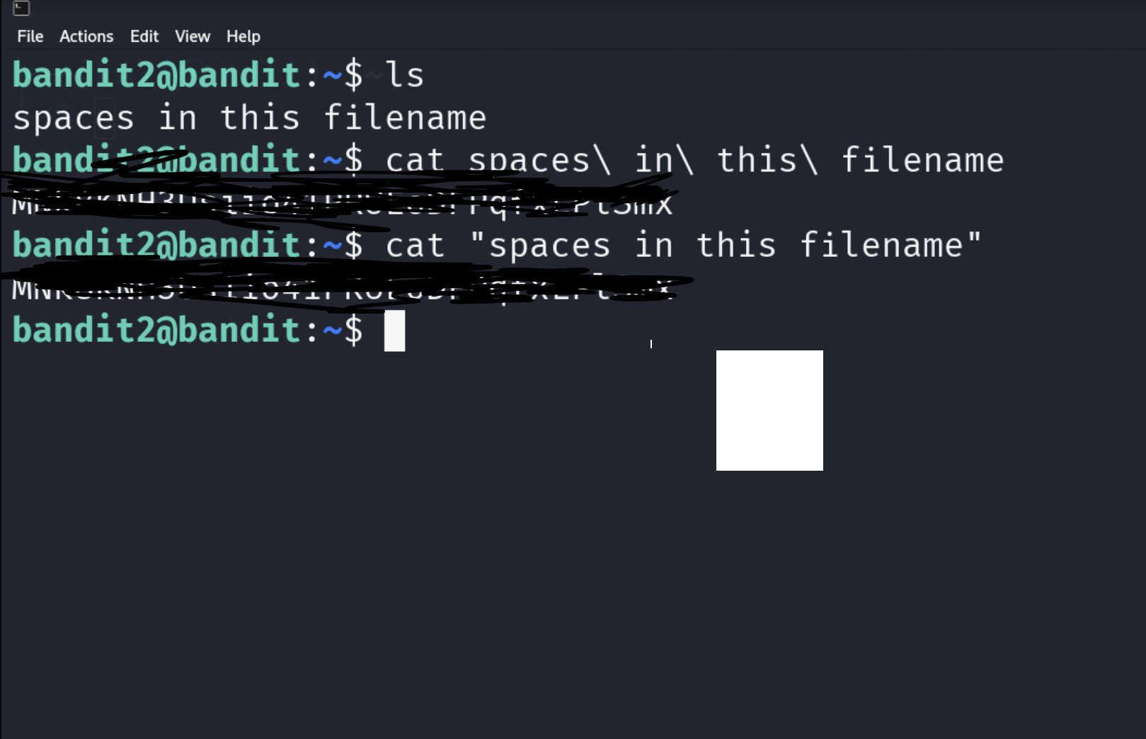 The password for the next level is stored in a file called spaces in this filename located in the home directory