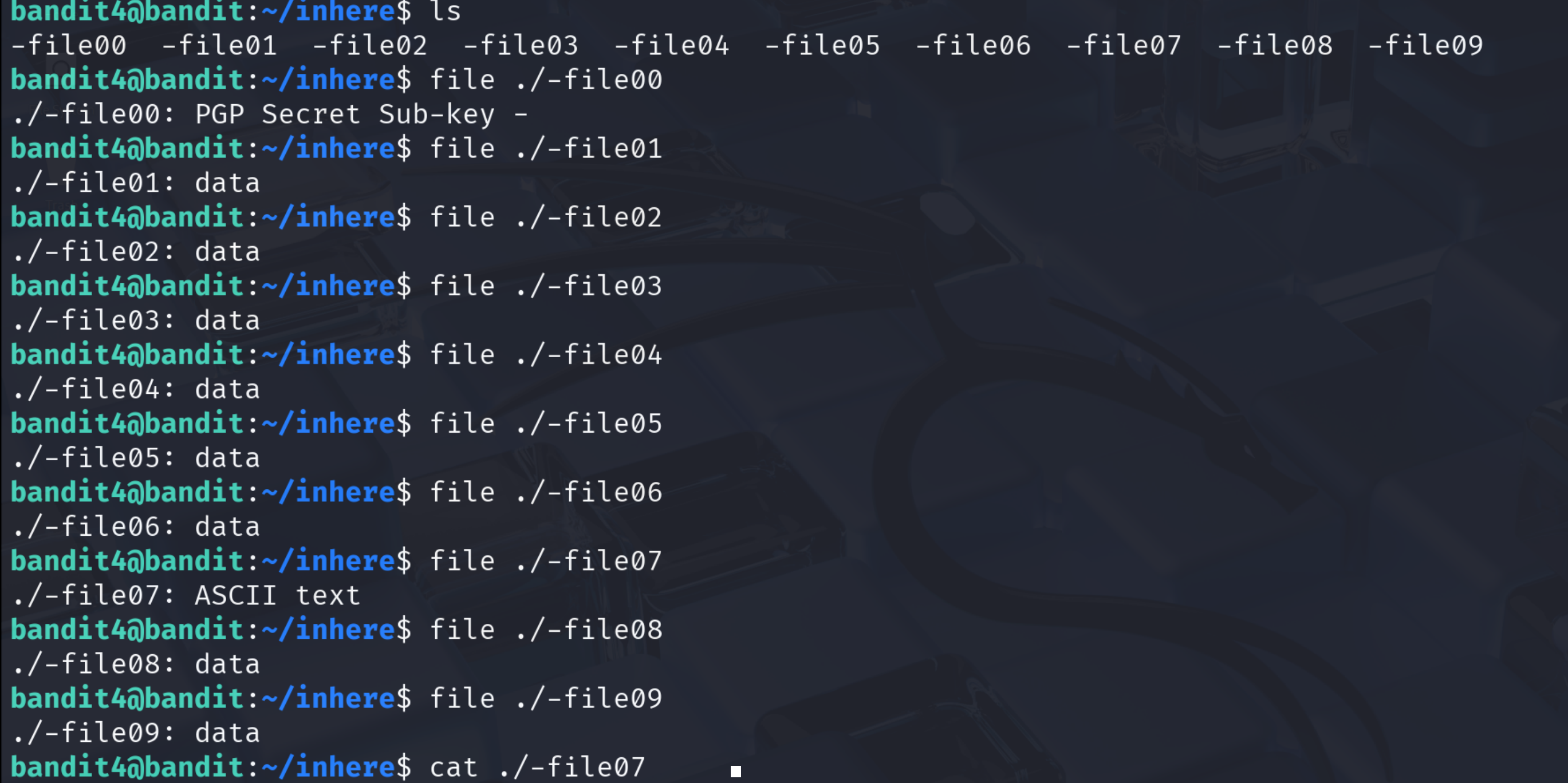The password for the next level is stored in the only human-readable file in the inhere directory. Tip: if your terminal is messed up, try the “reset” command.