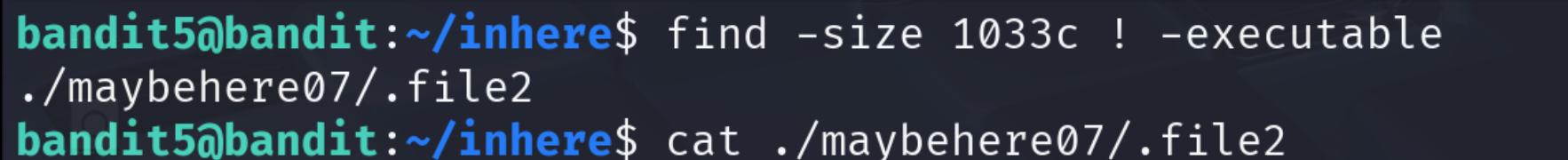 이번에는 find 명령어로 특정 조건을 걸고 찾을려고 했다. 원하던 접근은 1033바이트이면서 실행 가능하지 않은 파일을 찾을려고 했음 왜냐하면 inhere 디렉토리 안에는 여러개의 하위 디렉토리가 존재 했고, 그안에 존재하는 파일을 하나씩 다 찾기에는 시간이 많이 소요된다.
