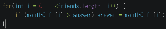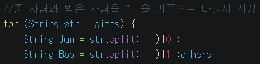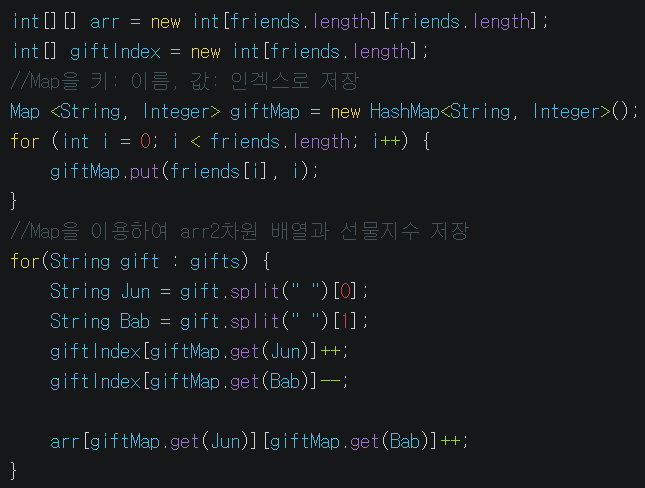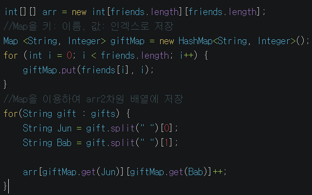 (수정 후) Map을 이용하여 for문을 줄인 것도 실행시간 단축에 도움이 되었다고 생각하지만 더욱 큰 이유는 굳이 선물지수를 구할 때 for문을 따로 다시 하는 것이 아닌 arr 배열 증감할 때 같이 계산한 것이 큰 이유일 것이라고 생각하였고 중복되는 부분에 주의하며 코딩해야 겠다고 느꼈다.