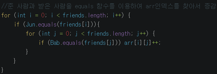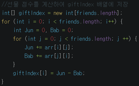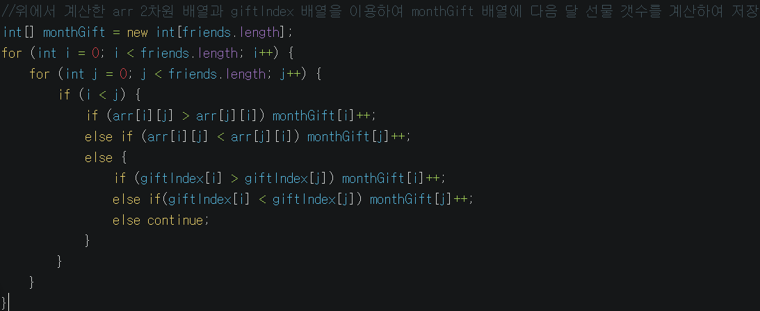또한 선물지수도 굳이 for 문을 한 개 더 써서 따로 계산하는 것이 아닌 위의 arr 2차원 배열 증감에서 같이 수행할 수 있을 것 같아 이 부분 또한 추가로 수정하였습니다.