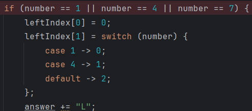 1, 4, 7 일 떄는 왼손으로 터치해야 되기 때문에 먼저 현재 왼손의 위치를 숫자 패드의 위치에 맞게 왼손 위치 배열의 값을 변경해줄 때 향상된 switch 문을 통해 간단하게 대입해주고 String answer 변수에 "L"를 더해주었다.
