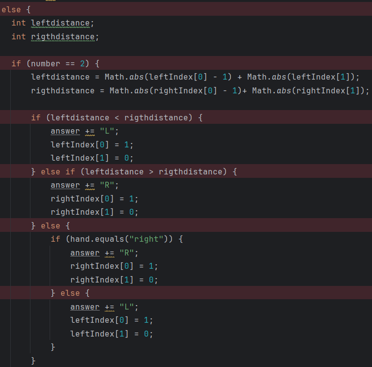 왼손의 위치와 오른손의 위치를 저장할 int형 변수를 선언해주고 Math.abs 메서드를 통해 정수의 절댓값을 반환하게 해주고 매개변수로는 왼손과 number의 x좌표와 y좌표의 차를 대입을 통해 거리 측정후 대입해주었다. 따라서 왼손의 거리가 작으면 "L", 오른손이 크면 "R", 같으면 주 손을 answer에 더하게 작성하였다. 나머지 5, 8, 0도 else if 조건문으로 똑같이 작성하여 문제를 해결하였다.