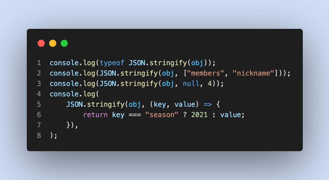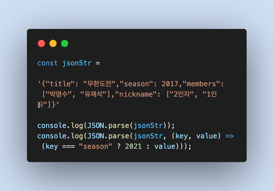 문자열을 받는다.- 두번째 인자는 콜백함수, 특정 키 정보를 담은 배열 받아 값을 변경한다.