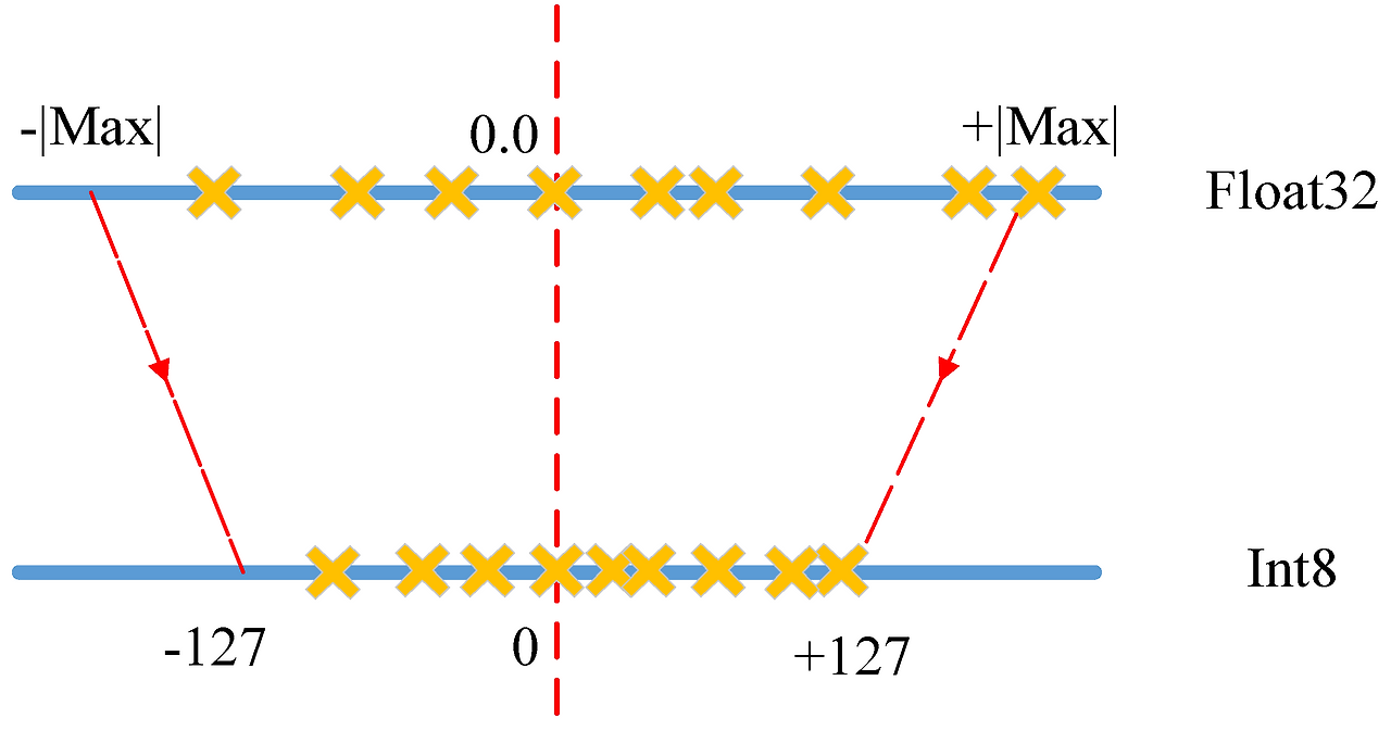 각 layer의 Weight/Activation function/Output의 Max/Min을 기준으로 다른 메모리공간을 차지하는 자료형으로 매핑하여