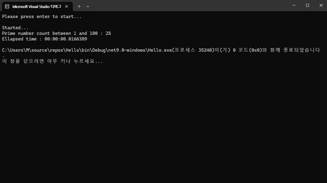IsPrime(long number) 메서드: 입력으로 받은 number가 소수인지 판별하여 bool 값을 반환한다.Main 메서드:from, to)를 가져온다.Parallel.For 메서드를 사용하여 from부터 to - 1까지의 숫자에 대해 병렬로 반복 작업을 수행한다.IsPrime() 메서드를 호출하여 현재 숫자가 소수인지 판별한다.lock (total) 문을 사용하여 total 리스트에 숫자를 추가한다. lock 문은 여러 스레드가 동시에 total 리스트에 접근하여 데이터 경쟁이 발생하는 것을 방지한다.from부터 to까지의 소수 개수와 경과 시간을 출력한다.Parallel.For 메서드