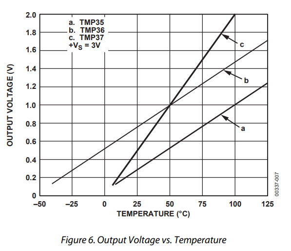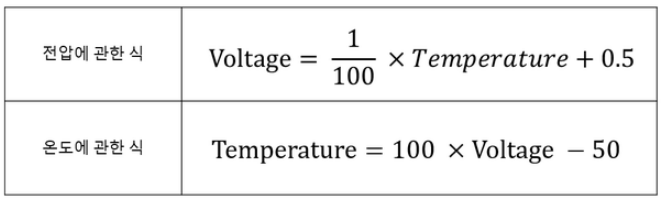 위 그래프에서 b가 TMP26인데, b는 y=ax+b와 같은 일차방정식 모양으로 나타나므로, 온도와 전압 사이의 관계를 일차방정식으로 정리할 수 있다. 일차방정식이므로 전압을 알면 온도를 구할 수 있고 온도를 알면 전압을 구할 수 있다.