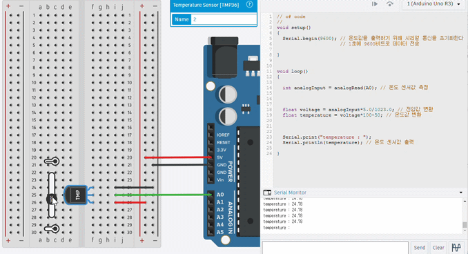 int analogInput = analogRead(A0); // 온도 센서값 측정
