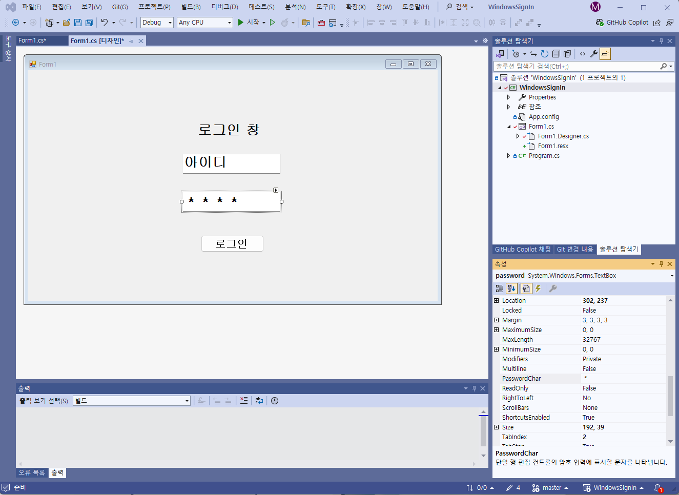 userId와 userPassword 변수에 저장된 값을 미리 입력해둔 값과 비교하는 데 어려움을 겪었습니다. string 클래스의 Equals() 메서드를 사용하여 문자열을 비교하는 방법을 찾아 적용했습니다.SignInButton_Click 메서드에 코드를 작성했습니다.id.Text와 password.Text를 사용하여 텍스트 박스에서 입력된 값을 가져왔습니다.Equals() 메서드를 사용하여 문자열을 비교했습니다. Windows Forms 기반의 간단한 로그인 창을 구현하여 C# 기본 문법과 윈도우 폼 컨트롤 활용 능력을 익히고, 로그인 기능을 통해 사용자 인증 과정을 이해하였습니다.