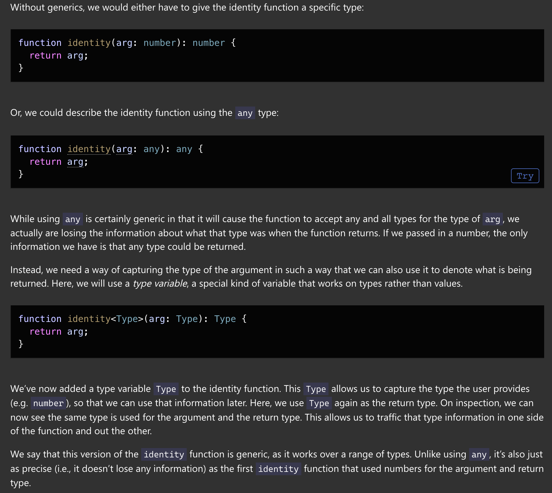 " 제네릭 타입이 없다면 특정 타입을 지정해줘야 하거나 any 를 사용 할 수도 있다. any 타입은 확실히 제네릭(포괄적)이긴 하지만 함수 반환시에 타입에 대한 정보를 잃게 된다. 그러므로 반환 타입을 명시해주기 위해서 제네릭타입을 사용한다."