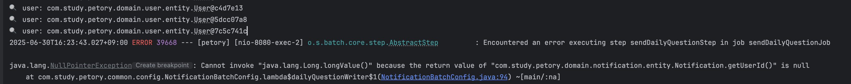 java.lang.NullPointerException: Cannot invoke "java.lang.Long.longValue()" because the return value of "com.study.petory.domain.notification.entity.Notification.getUserId()" is null