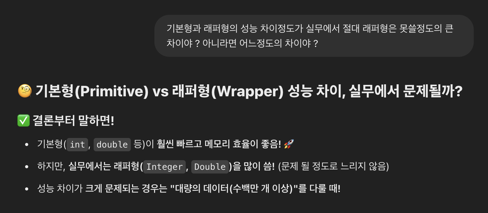 System.out.println("성능 차이 (배수): " + (double) wrapperTime / primitiveTime);
