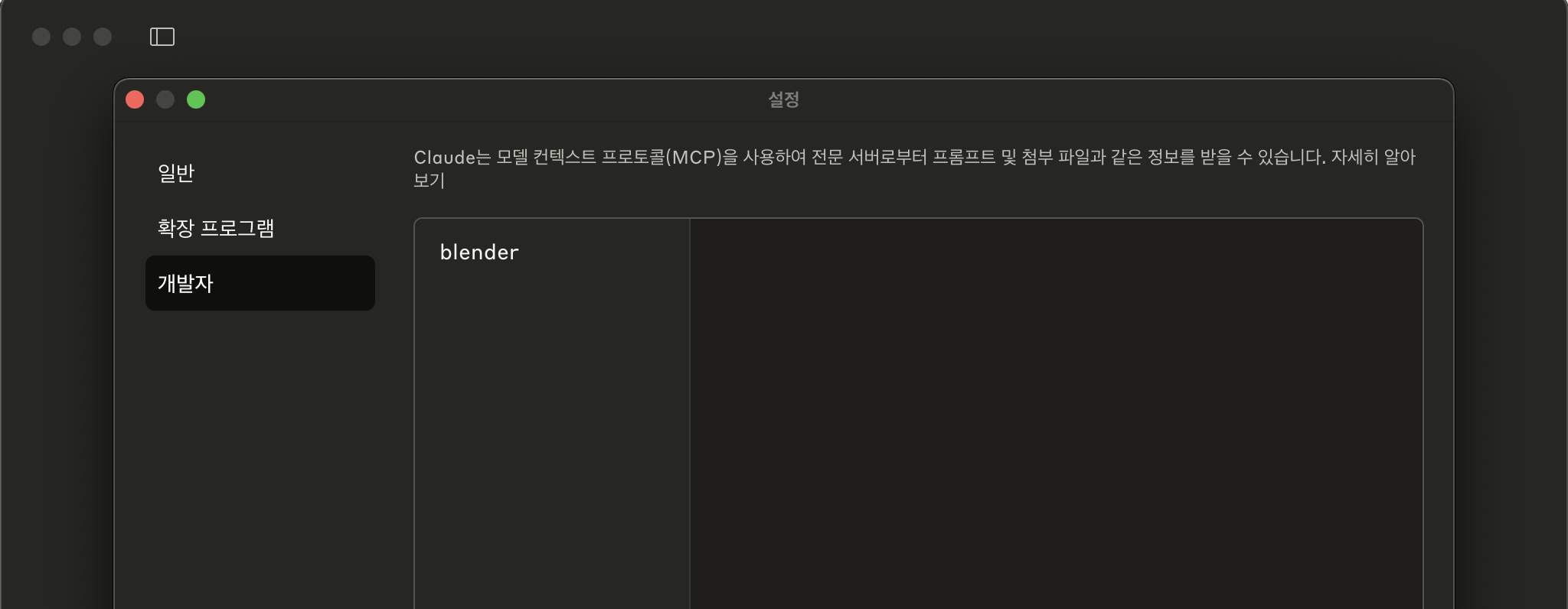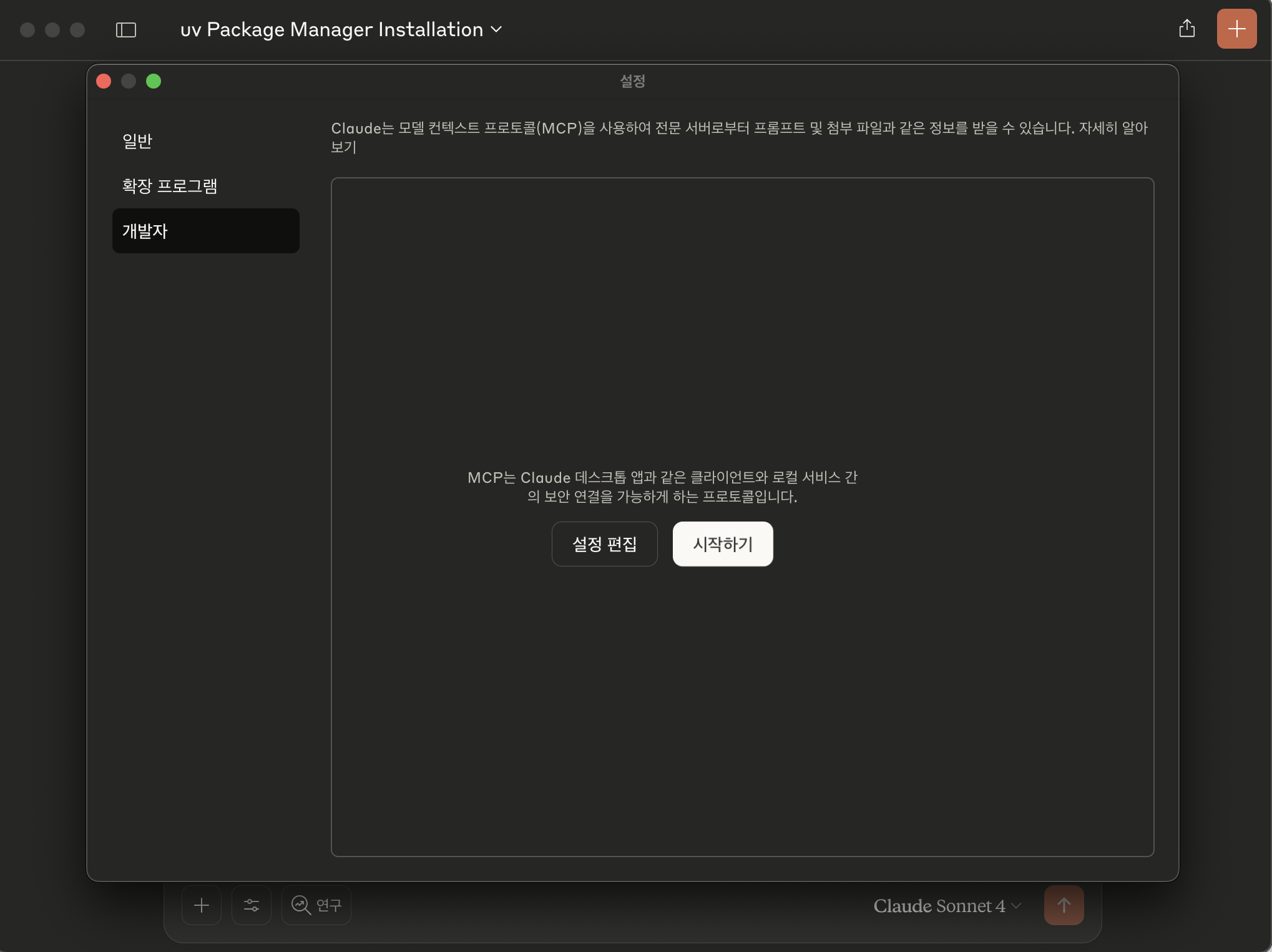 설치가 완료되면 클로드에 들어가 왼쪽 위 Claude -> 설정 -> 개발자에 들어가면