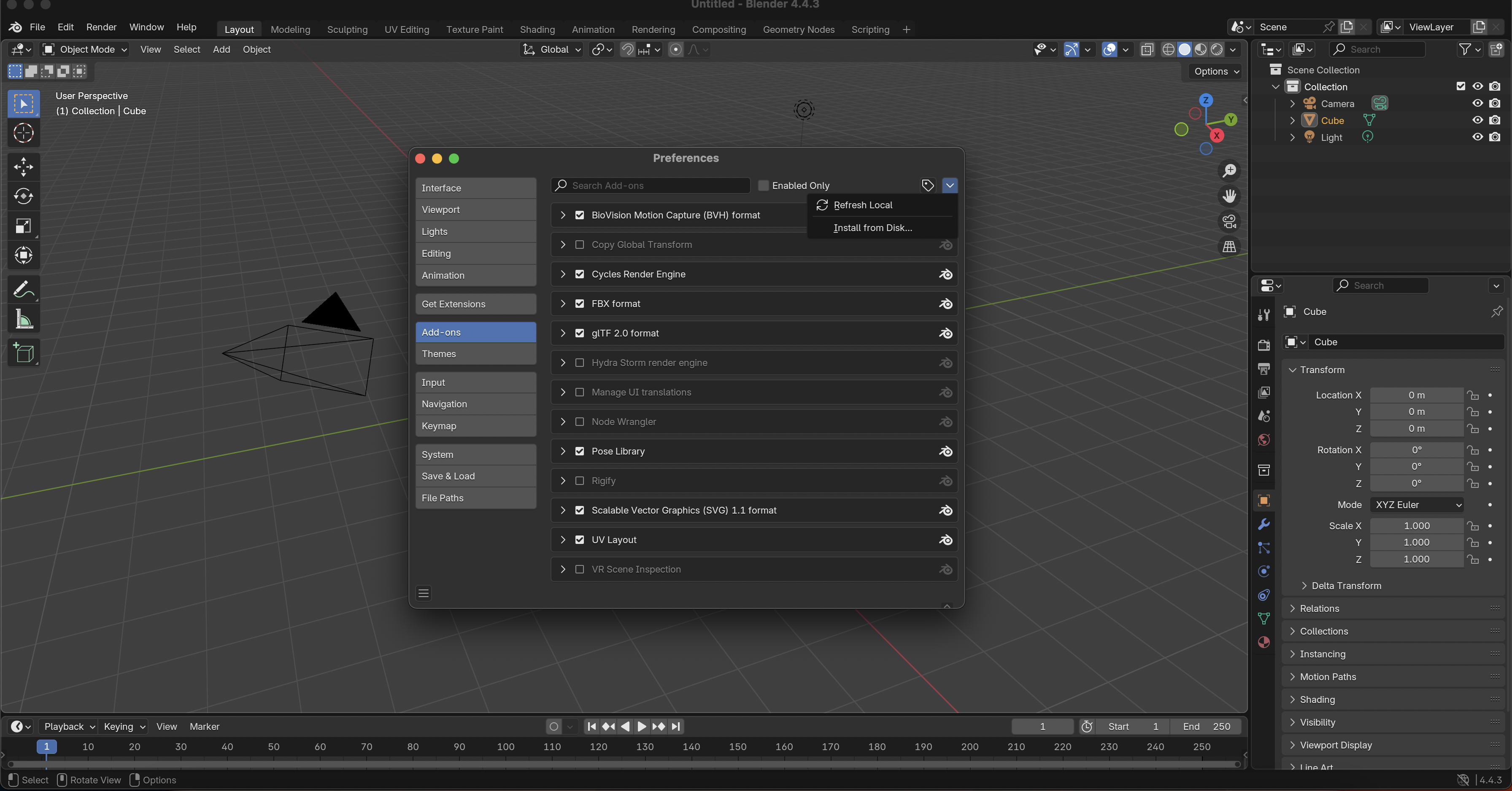그 다음 Edit -> preference -> Add-ons -> Install from Disk를 눌러