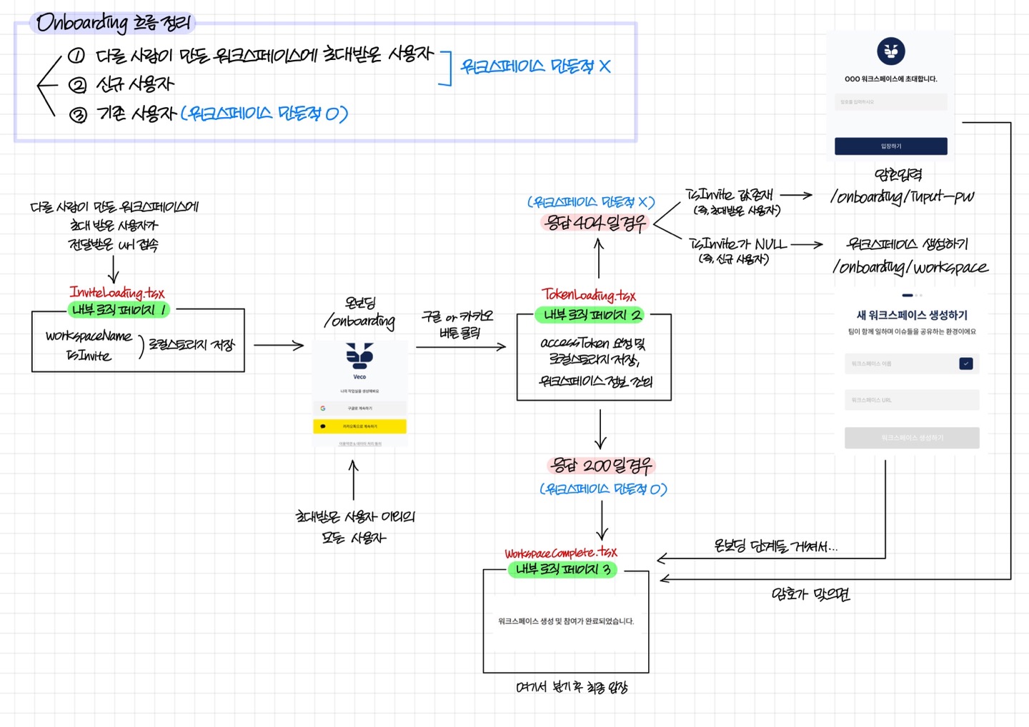 사진 속 플로우에 따라 그대로 코드를 옮기면 되었다. 그리고 accessToken 요청해 저장하는 로직을 /onboarding/workspace에서, /onboarding/loading 으로 따로 분리하였다는 점!