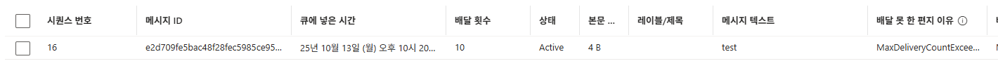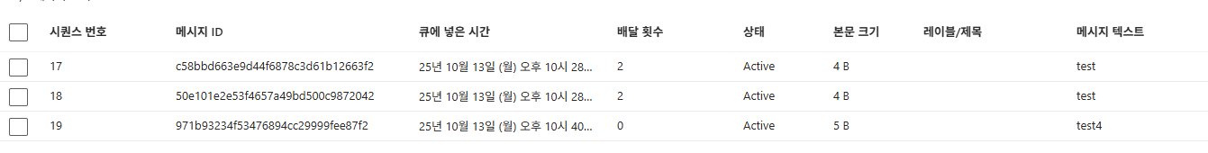 큐에 메시지가 쌓이는 것을 확인할 수 있었다.