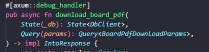 | --- ^^^^^^^^^^^^^^^^^^^^^^^^^^^^ the trait `Handler<_, _>` is not implemented for fn item `fn(State<DbClient>, Query<...>) -> ... {download_board_pdf}`
