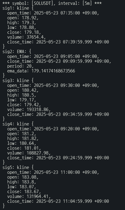 symbol, interval, limit을 설정하여 캔들에 대한 정보를 얻어와 Vec형태로 가지고 있는다. 캔들에 대한 정보는 아래와 같다.