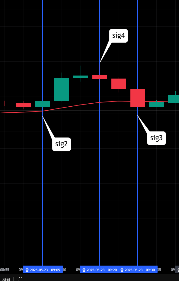 sig1부터 sig5의 알고리즘을 만족했기때문에 sig1의 가격이 매수 타점이 되는 것이다. 그러나 이번 매매에서는 실패를 했다.